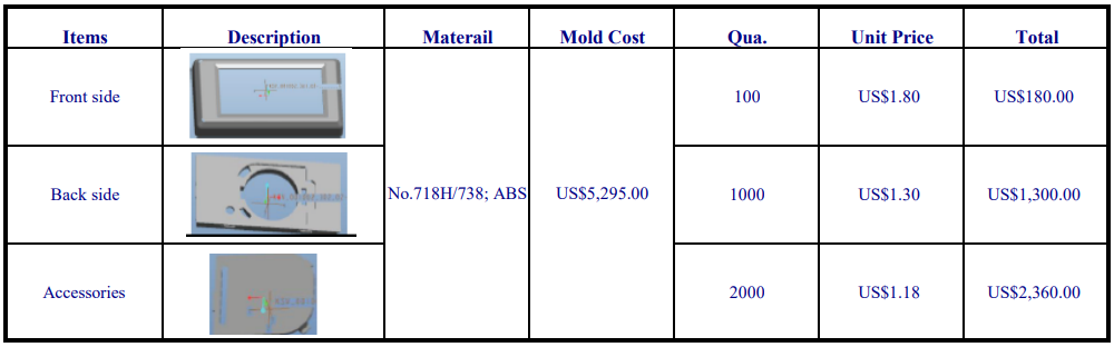 Корпус электронных ценников состоит из трёх деталей. Обратившись в одну из китайских компаний мы получили коммерческое предложение на изготовление пресс-формы и литью одного корпуса в случае партий, состоящих из 100, 1000 и 2000 штук.
