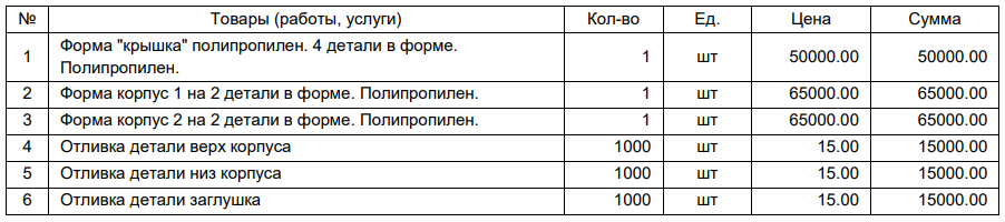 Литьё на вертикальном термопластавтомате происходит в полуавтоматическом режиме. Оператор вручную собирает пресс-форму и устанавливает её в автомат. Далее автомат выполняет впрыск. После отливки оператор вручную разбирает пресс-форму и извлекает готовую деталь. Стоимость изготовления пресс-формы для литья на таком автомате намного дешевле, чем изготовление пресс-формы для литья на полностью автоматическом станке. Обратившись в одну из компаний получили следующее коммерческое предложение.